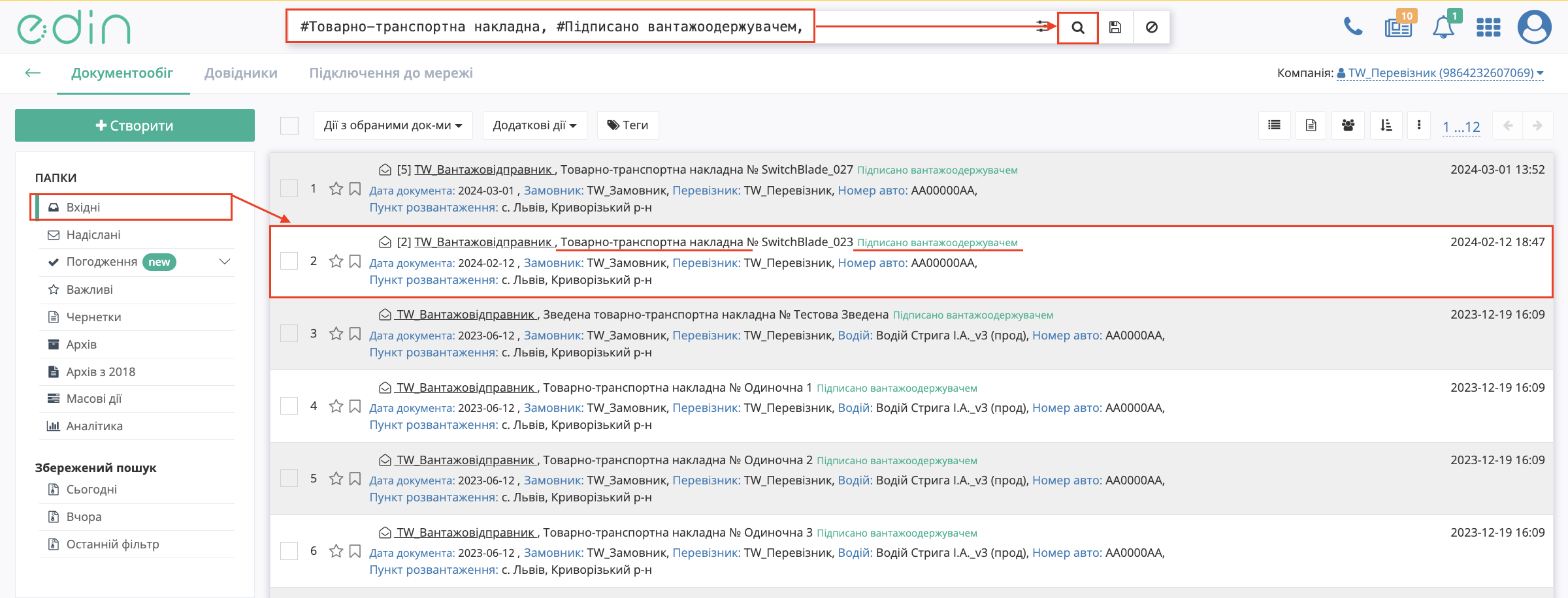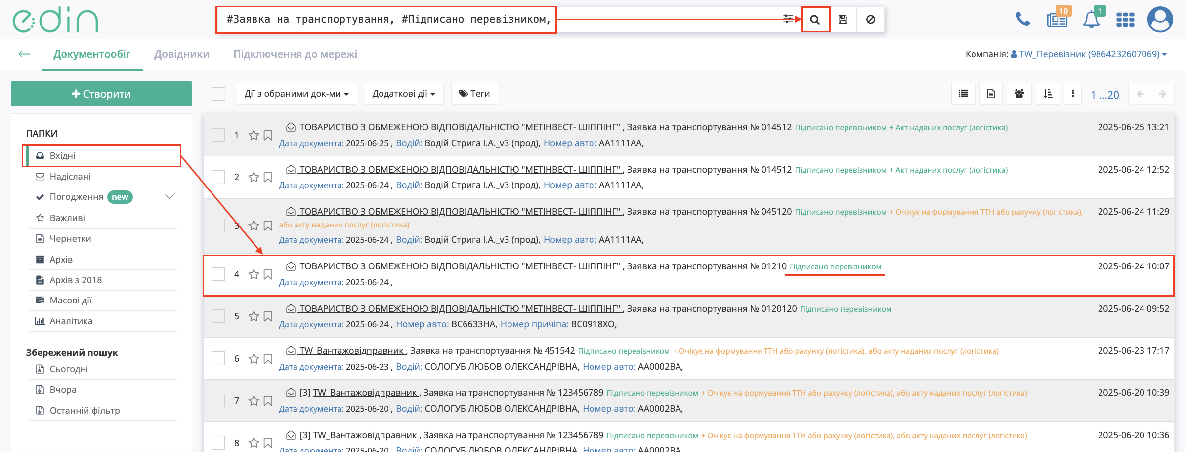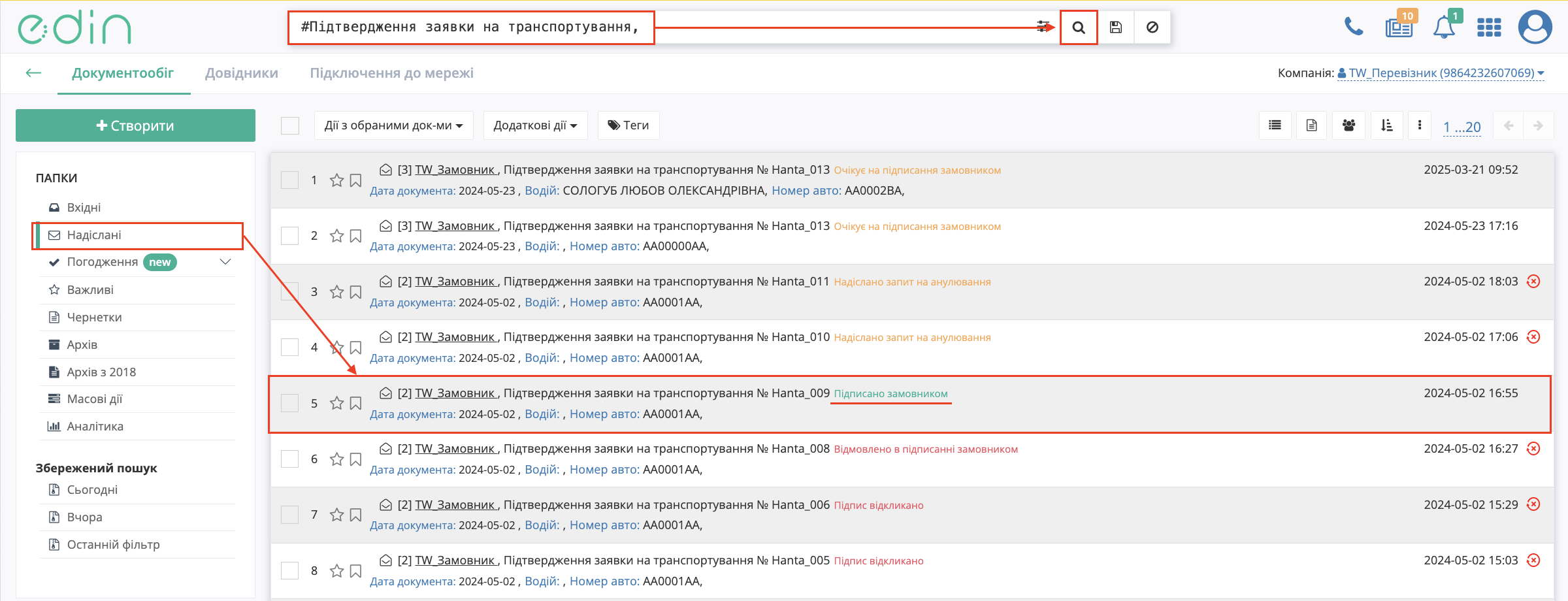 - Переконайтесь, що документ має статус «Підписано перевізником»