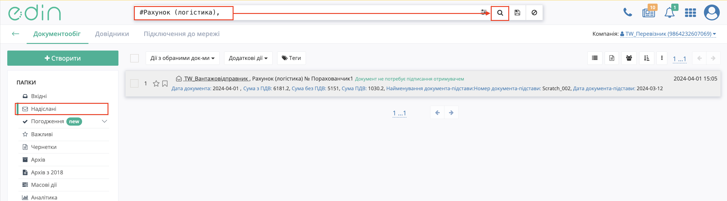 Зображення 4 – Вибір «Рахунку (Логістика)» у розділі «Надіслані»