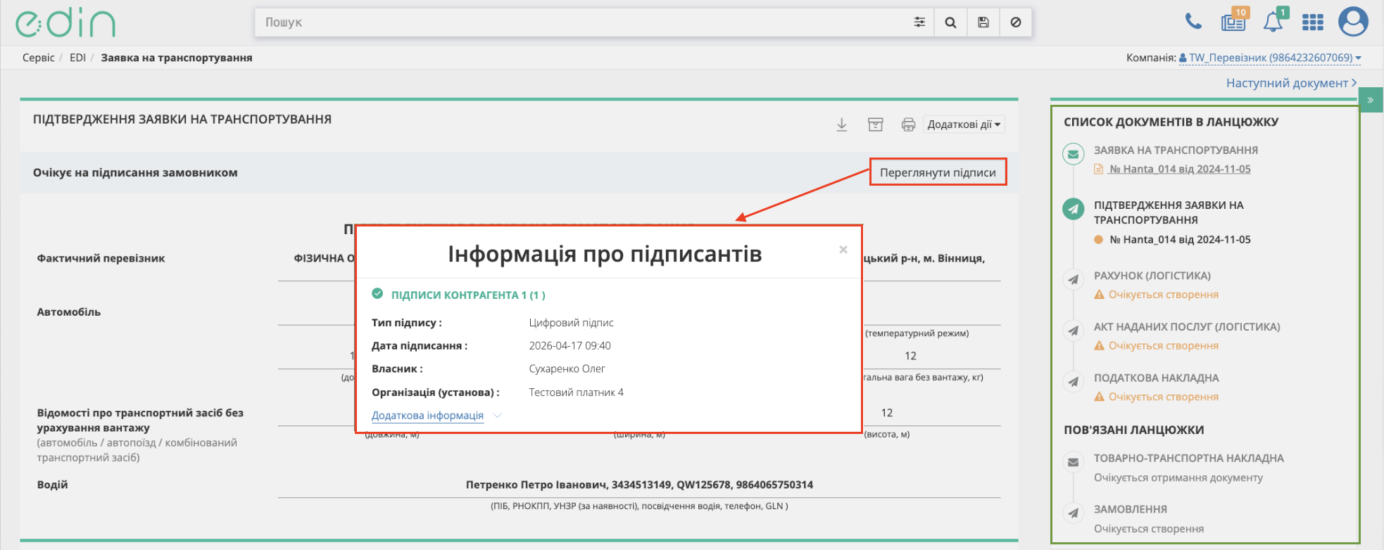 «Заявку на транспортування» в статусі «Очікує підписання перевізником» попередньо можливо «Підписати»: