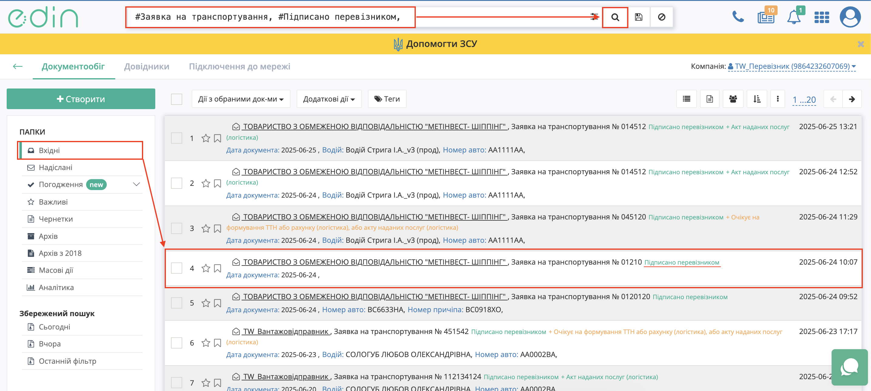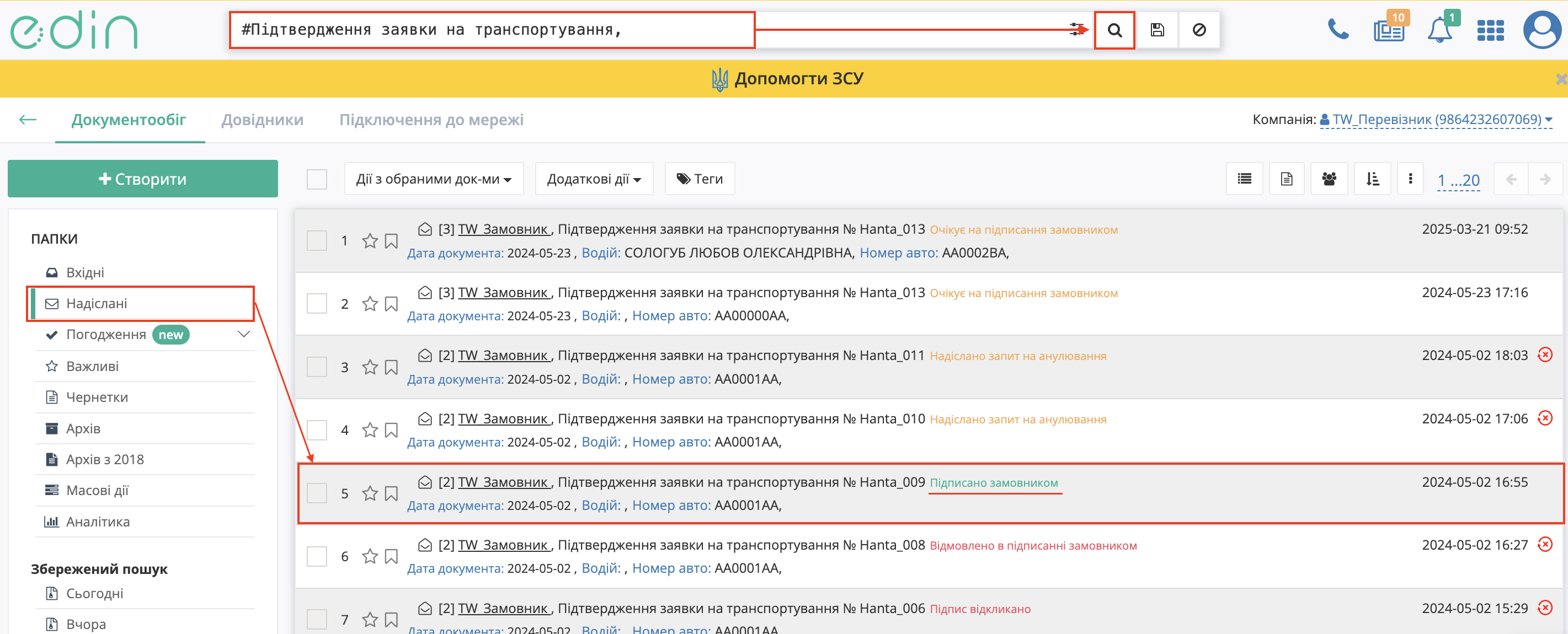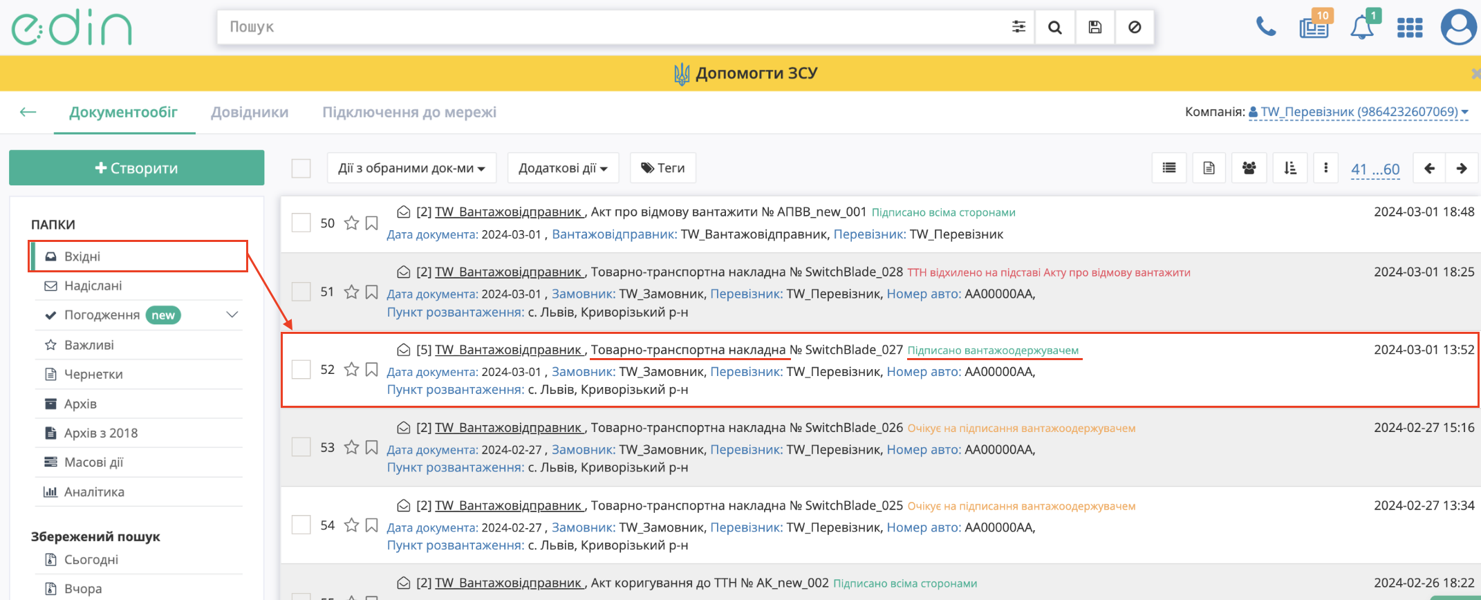 - Переконайтесь, що документ має статус «Підписано перевізником»