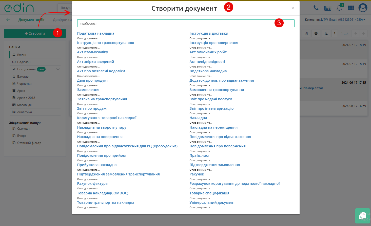Після цього відкриється вікно «+ Створити документ» (Покажчик 2), у якому зі списку оберіть потрібний тип документа або скористайтесь пошуком за назвою документа.документа (Покажчик 3).