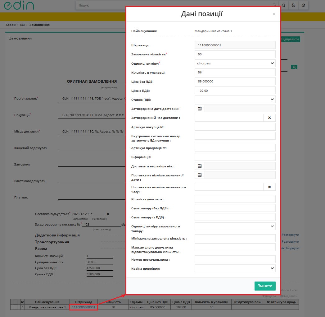 Для доданих в табличну частину «Замовлення» товарних позицій можна відредагувати замовлену кількість прямо в таблиці або змінити дані позиції в розширеній формі після натискання на штрих-код позиції (Зображення 7).