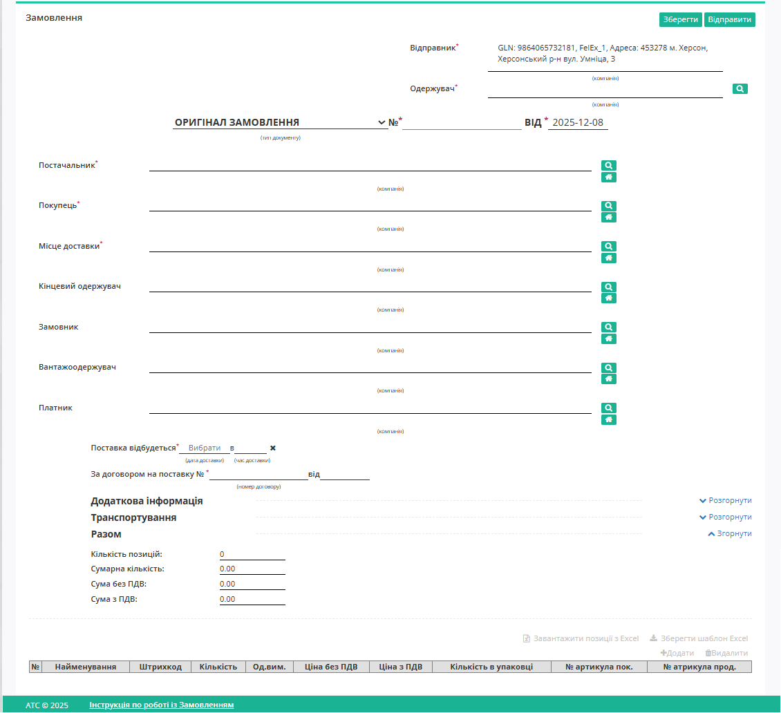 - Блоки Додаткова інформація та Транспортування необов’язкові для заповнення і згорнуті за замовчуванням. Блок Разом розраховується автоматично після заповнення табличних позицій.