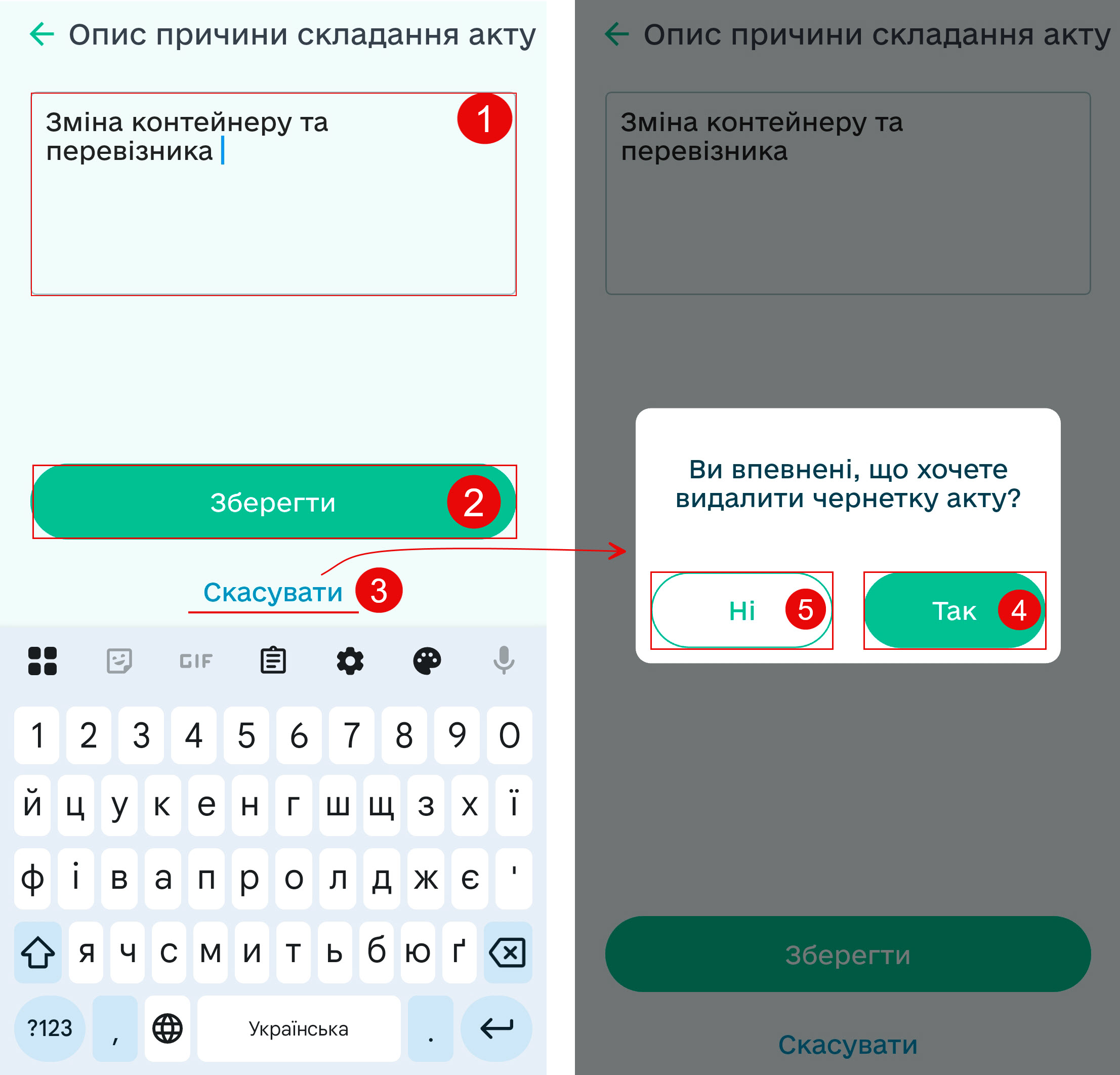 Для підтвердження дії натисніть кнопку «Зберегти», для скасування — кнопку «Скасувати» (покажчик 2/3).