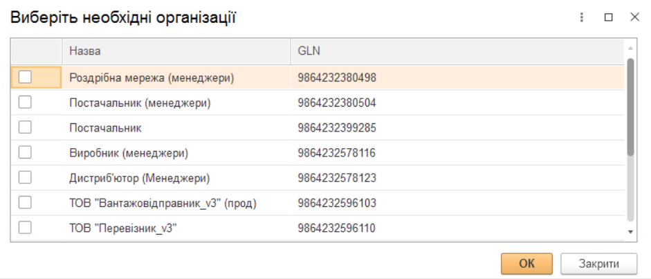 - Мережі (Зображення 4, Покажчик 1)- відкриває вікно переліку всіх доступних мереж (Зображення 5). З цього переліку необхідно в стовбці «Вибрати» відмітити мережі (контрагентів), з якими користувач буде обмінюватися документами (вибір впливає на заповнення довідника Контрагенти) та натиснути кнопку «ОК».
