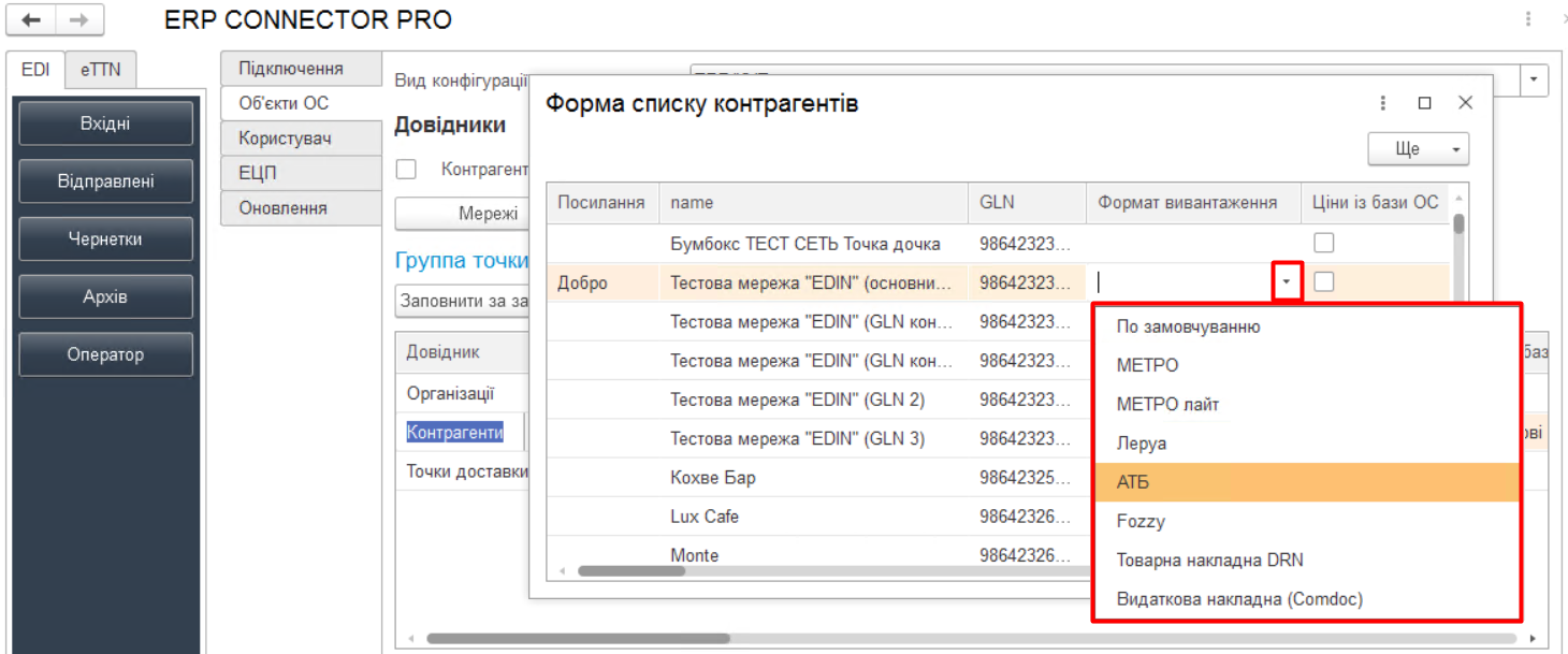 Зображення 25 - Прив’язка контрагентів бази ОС до GLN контрагентів мережі - На Формі списку контрагентів вкажіть формат вивантаження відповідно до обраної мережі, обравши з випадаючого списку (Зображення 26).