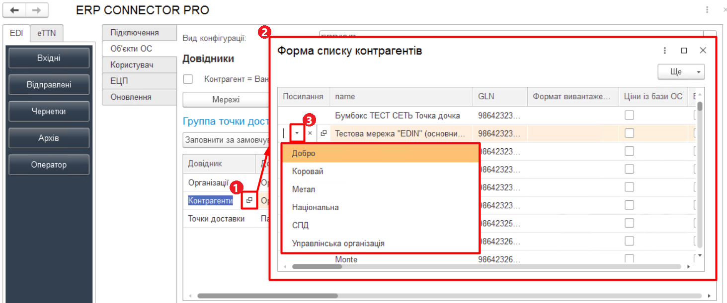 Зображення 7 - Довідник номенклатури контрагентів/постачальників - Мережі з особливою схемою роботи (Зображення 4, Покажчик 4) – відкриває довідник налаштування для мереж, в яких GLN контрагента співпадає з GLN точки доставки, тому потрібно вказувати, в якому полі знаходиться GLN контрагента для відправки документів (Зображення 8).