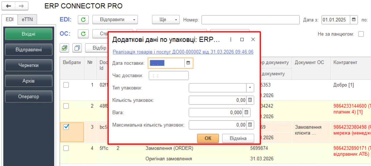 Якщо ERP Connector PRO автоматично не розпізнав Контрагента/Організацію/Точку доставки — можна через подвійний клік по об’єкту в журналі вручну вибрати з довідника ОС (налаштування).