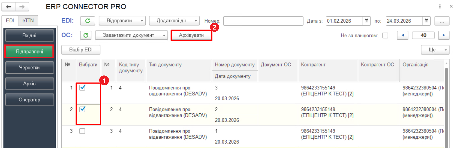 Щоб додати документ до архіву безпосередньо в модулі ERP Connector PRO, відмітьте його галочкою (Зображення 9, Покажчик 1) та натисніть кнопку «Архівувати», яка доступна на панелі інструментів розділів «Вхідні» та «Вихідні» (Зображення 9, Покажчик 2). Обрані документи будуть перенесені в розділ «Архів».