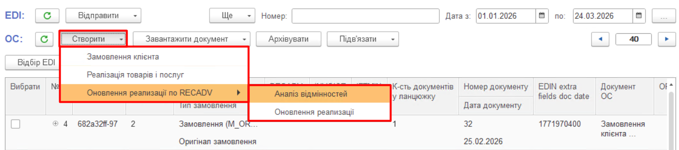 При натисканні кнопки «Створити» є додаткова опція «Оновлення реалізації по RECADV», яка дозволяє провести аналіз відмінностей між реалізацією облікової системи та документом EDI «Повідомлення про прийом» (RECADV), а також за потреби перенести необхідні зміни з RECADV в EDI реалізацію за допомогою кнопки «Оновлення реалізації» (Зображення 13).