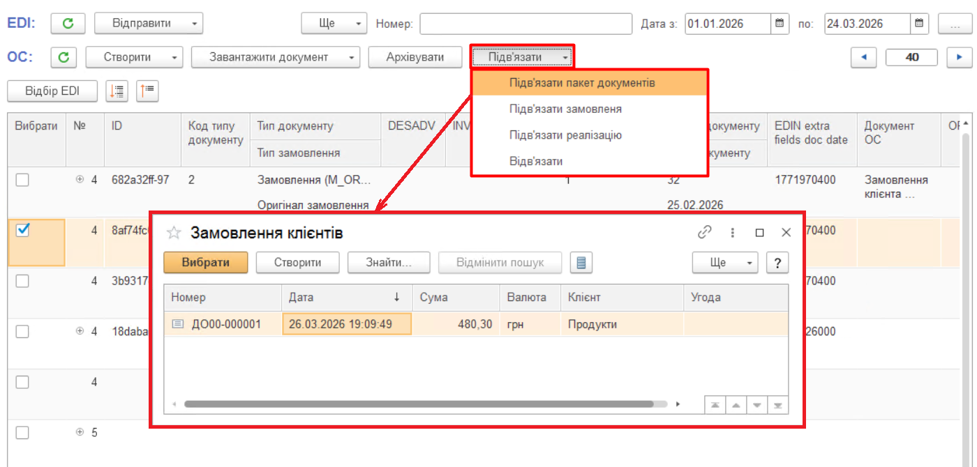 Зображення 12 - Підв'язати ланцюжки документів EDI до уже створених документів ОС