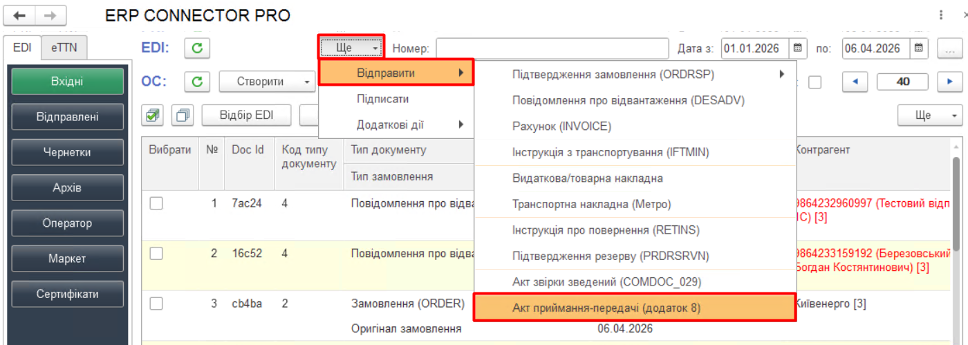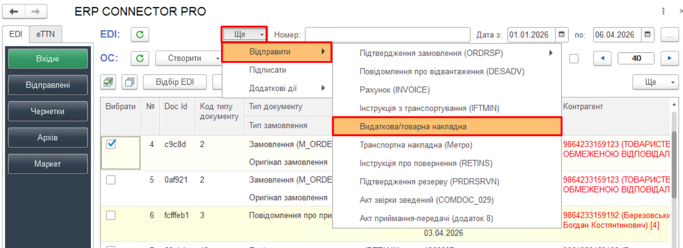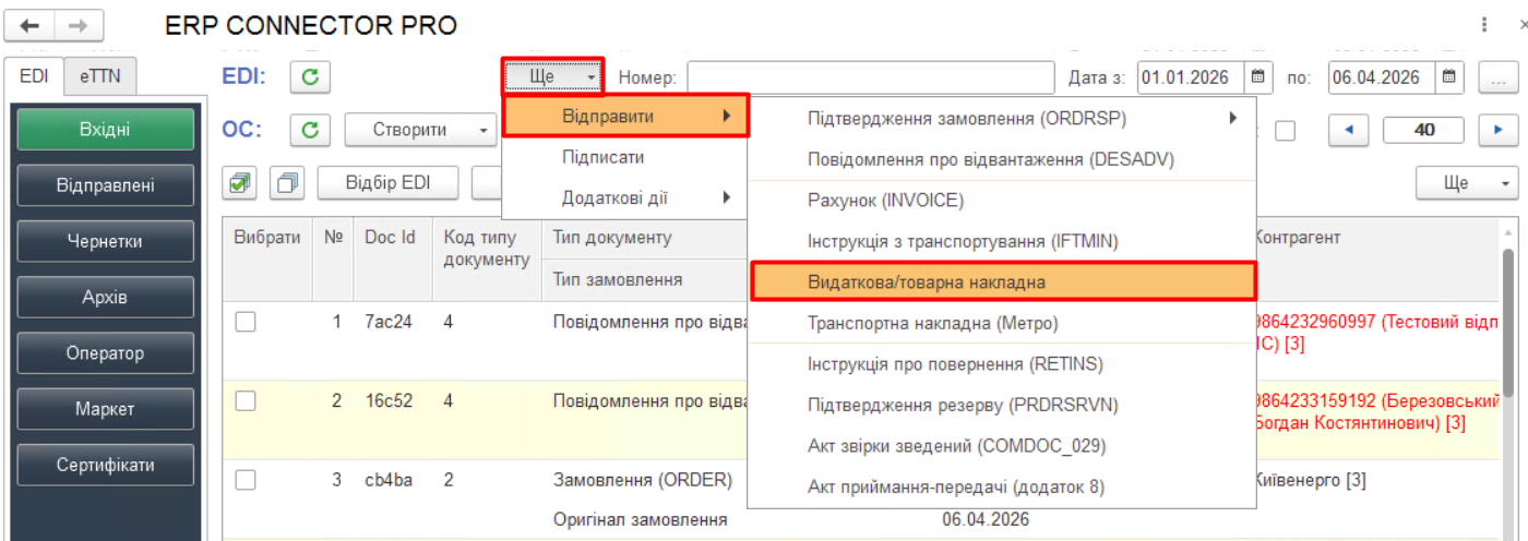 - Натисніть кнопку «Відправити» та оберіть з випадаючого списку необхідний EDI-документ (Зображення 3).