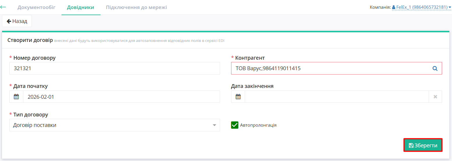 - Відкриється форма створення нового договору (Зображення 2). Заповніть всі необхідні поля (обов’язкові поля позначені червоною зірочкою *)