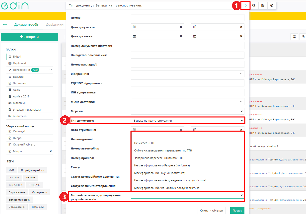 Для документів «Заявка на транспортування» та «Підтвердження заявки на транспортування» реалізовані додаткові текстові мітки, які доступні у розширеному пошуку у полі «Готовність заявки до формування рахунків та актів» (Зображення 11, Покажчик 3):