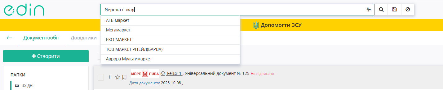 Мережа: АТБ,- пошук в обраній теці всіх документів з мережею АТБ; -